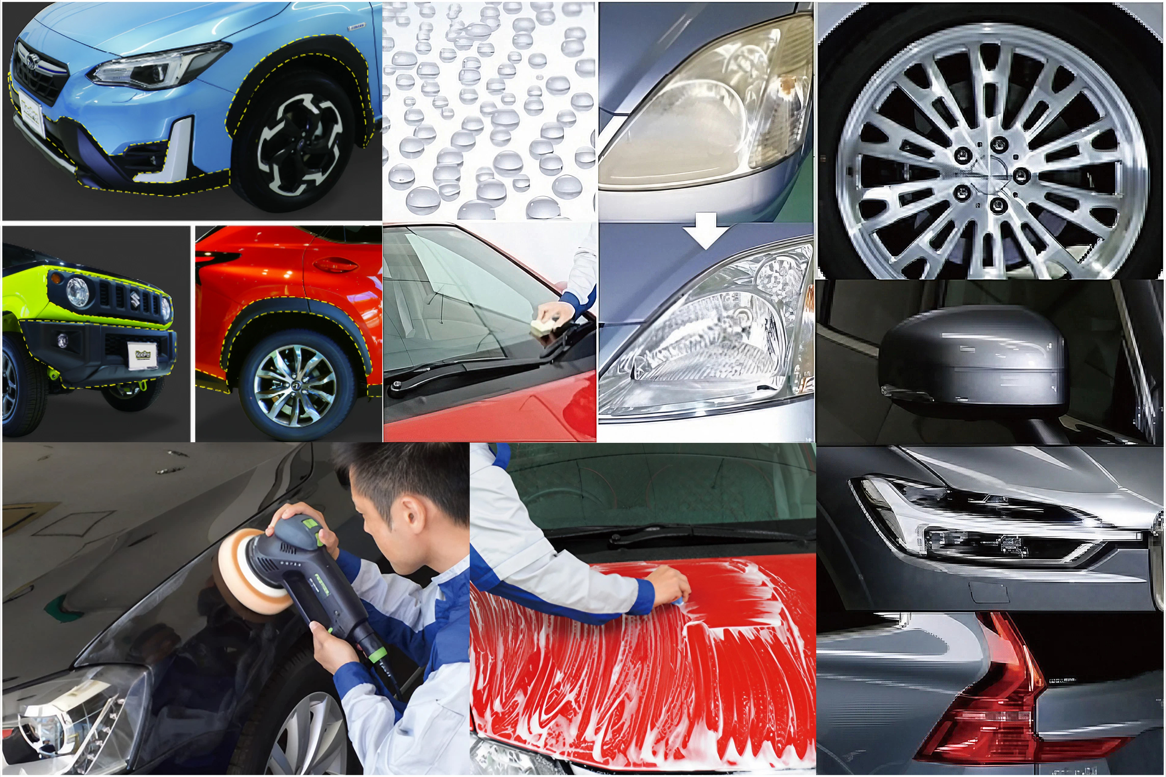 | 施工箇所 | ①窓ガラス全面 ②アルミホイール4本 ③ヘッドライト ④テールレンズ ⑤サイドバイザー(ある場合) ⑥樹脂フェンダー ⑦ドア内側のステップ部分 ⑧ボンネット裏側 ⑨トランクの裏側 ⑩給油口の内側 ⑪エンジンルームの中 ⑫車内清掃 |